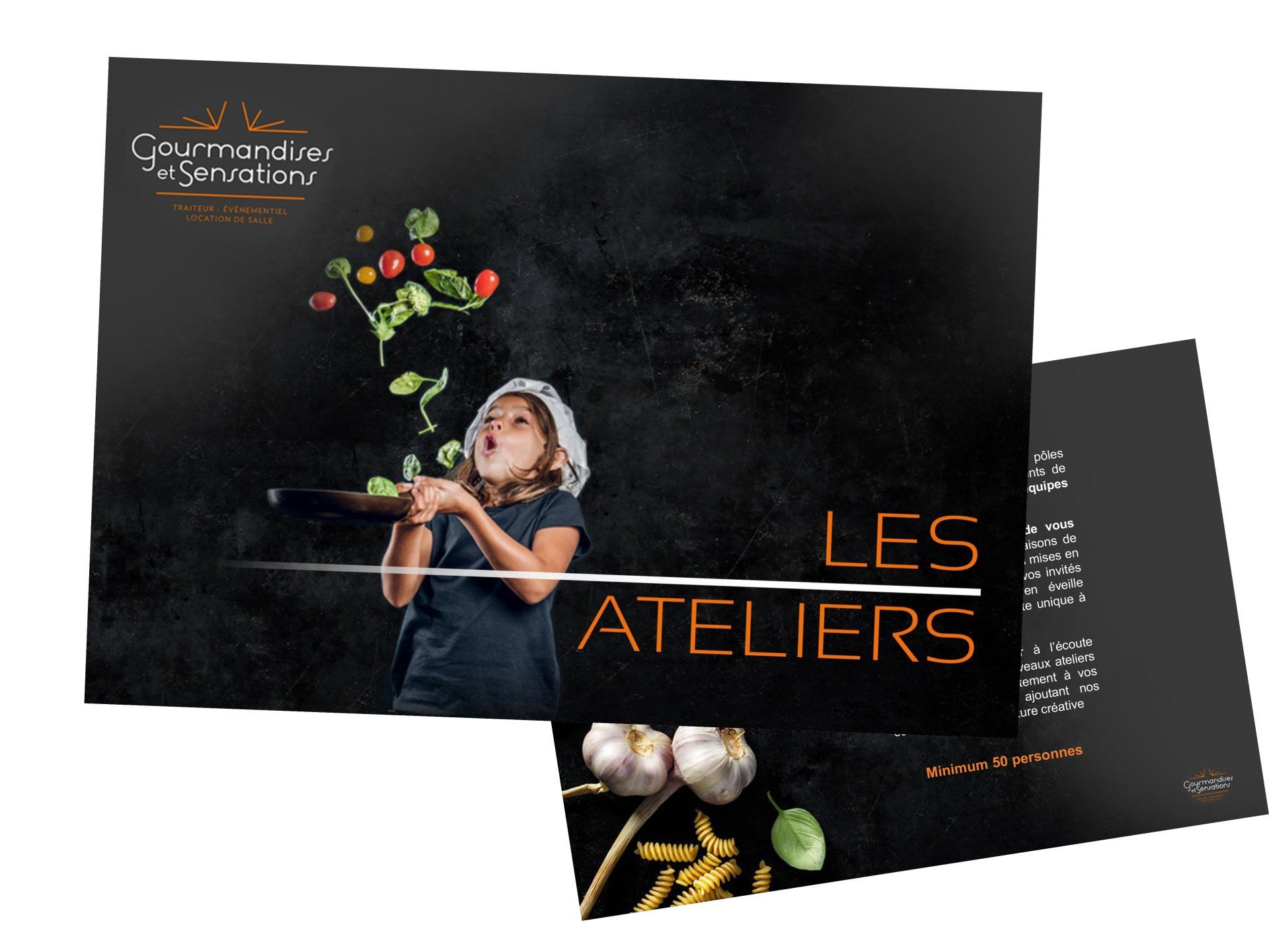 Réalisation de ses différentes plaquettes (Mariage, buffet, cocktails, plats à emporter, ateliers, plateaux repas...) et création d'étiquettes pour ses créations " Les P'tites Gourmandises" la nouveauté de cette année !